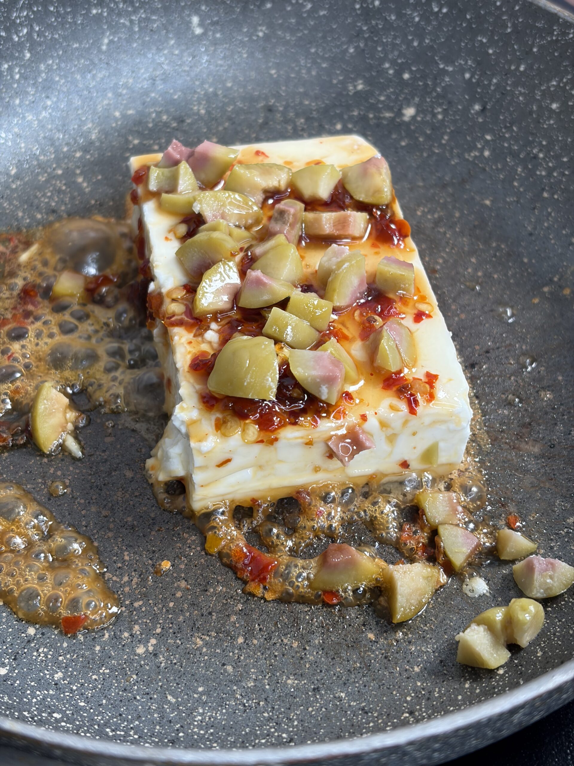 Pour the prepared hot honey over the fried feta. Allow it to sizzle and infuse into the cheese for a minute or two, coating the feta evenly.